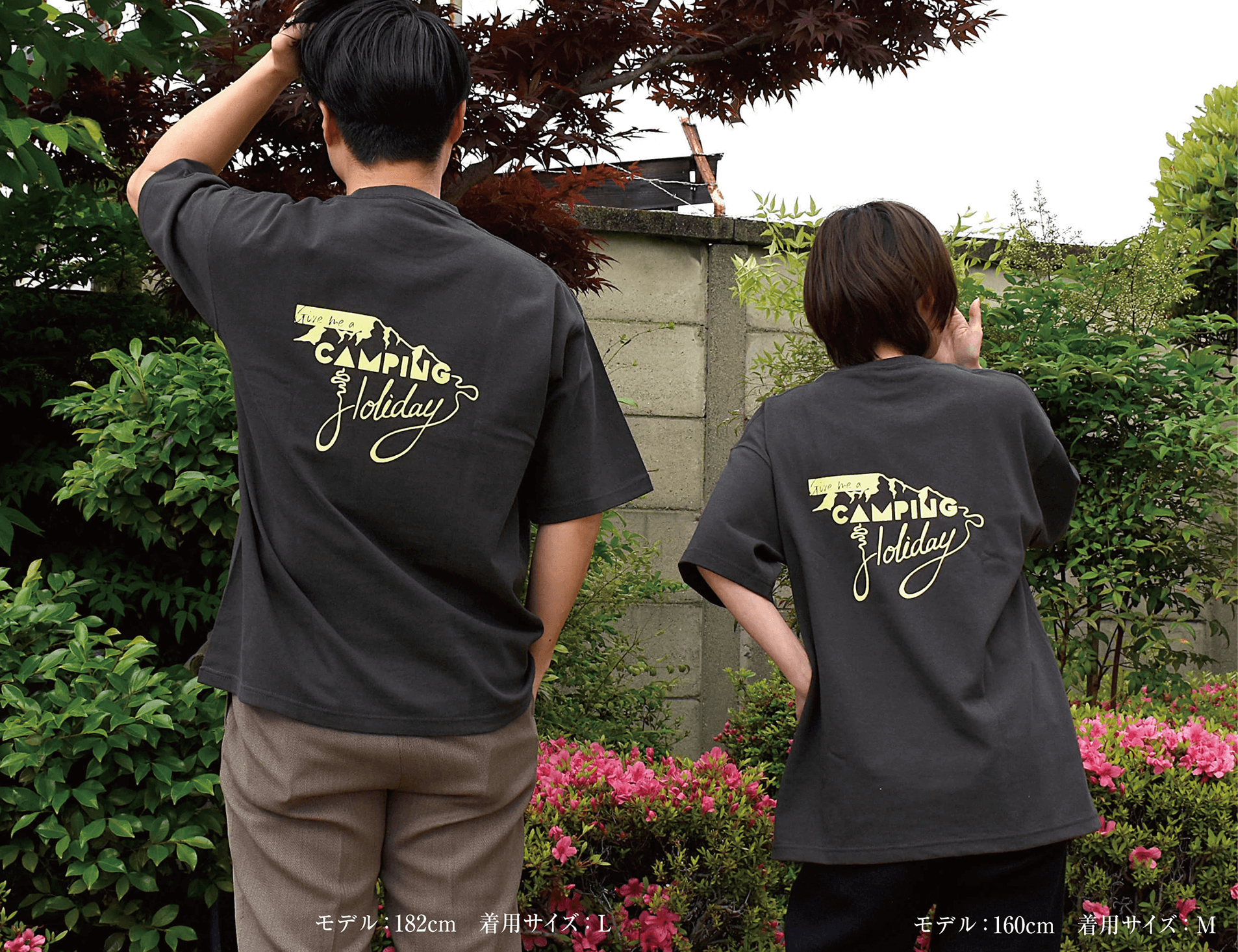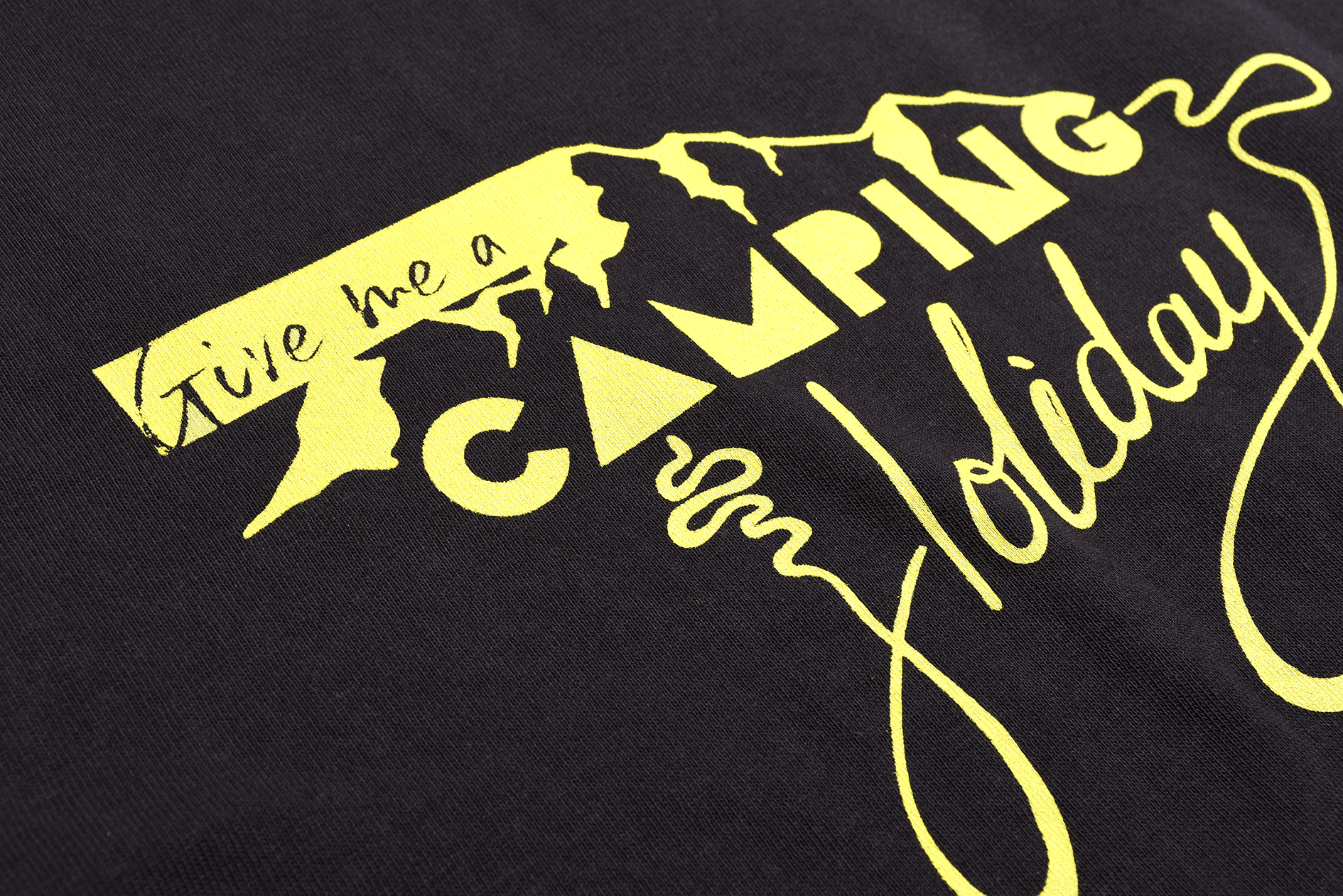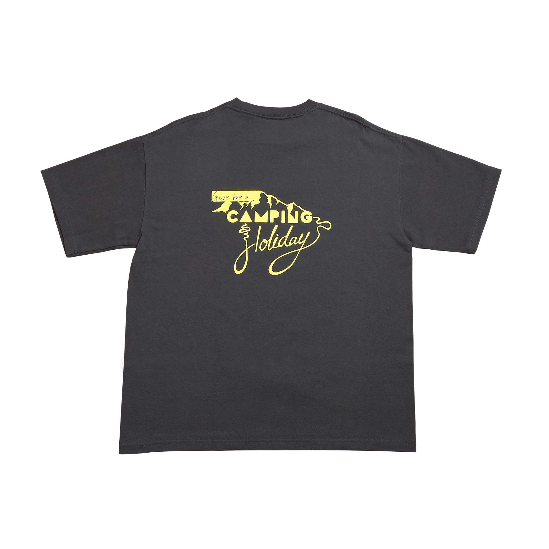 キャンプ場のある山へとうねうね登っていく、山道をHolidayの文字で表現した、そんなデザインを墨地に鮮やかなレモンイエローでプリント。