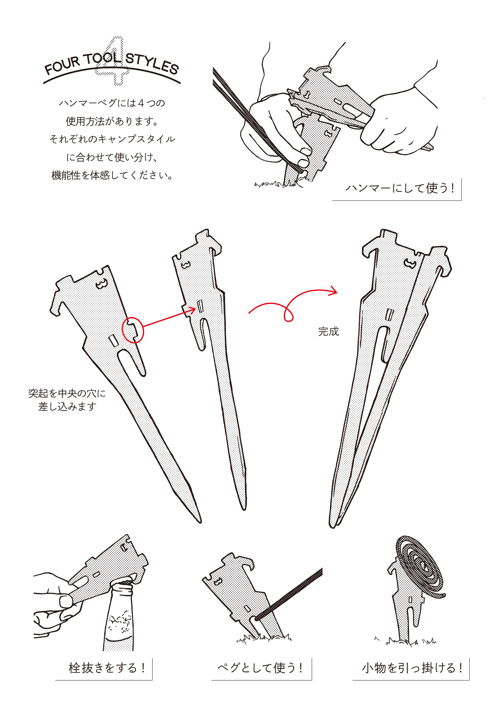 もちろんペグとしても使用でき、他にも栓抜きや蚊取り線香を掛けるなど、それぞれのキャンプスタイルに合わせた使い方ができる万能ペグです。