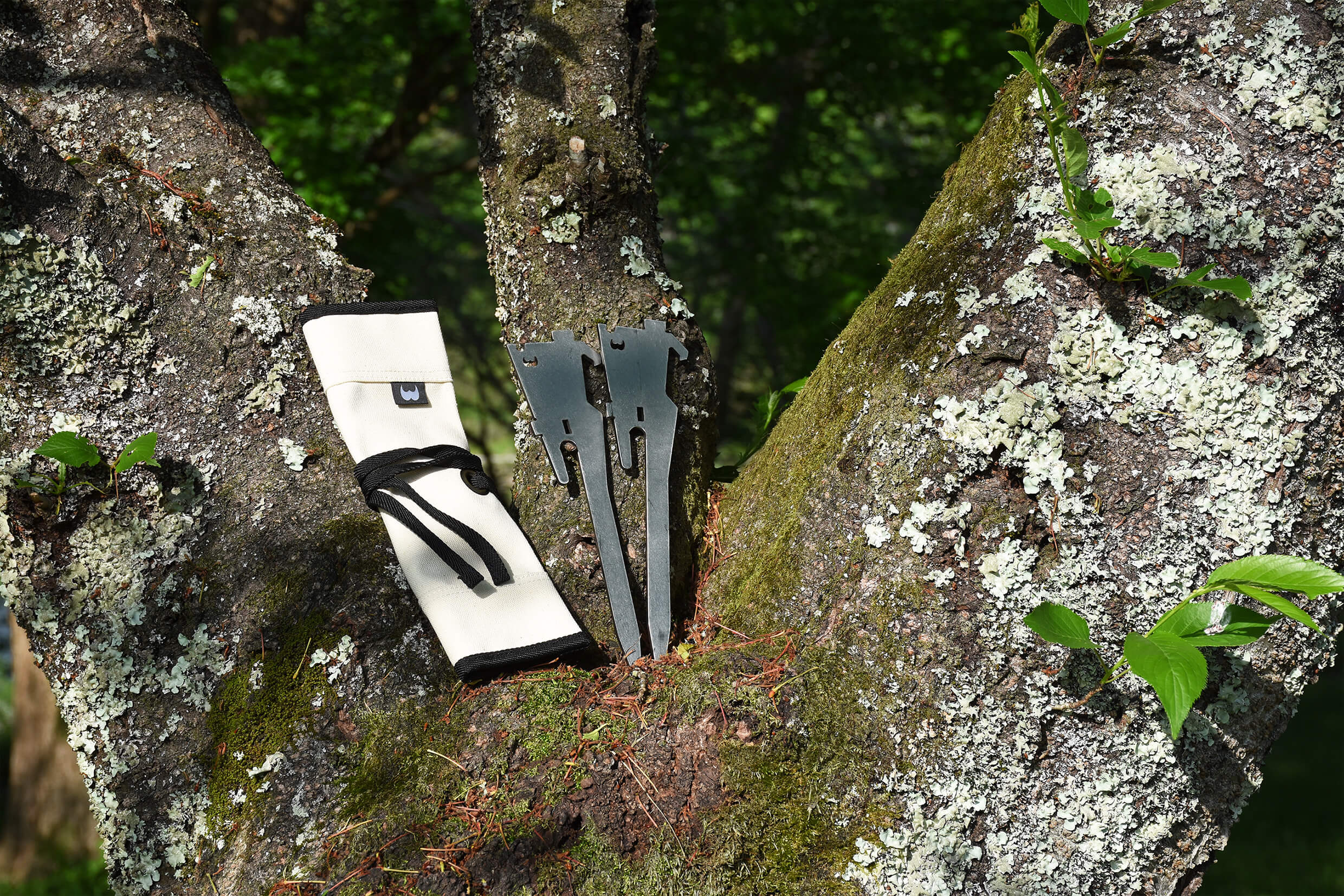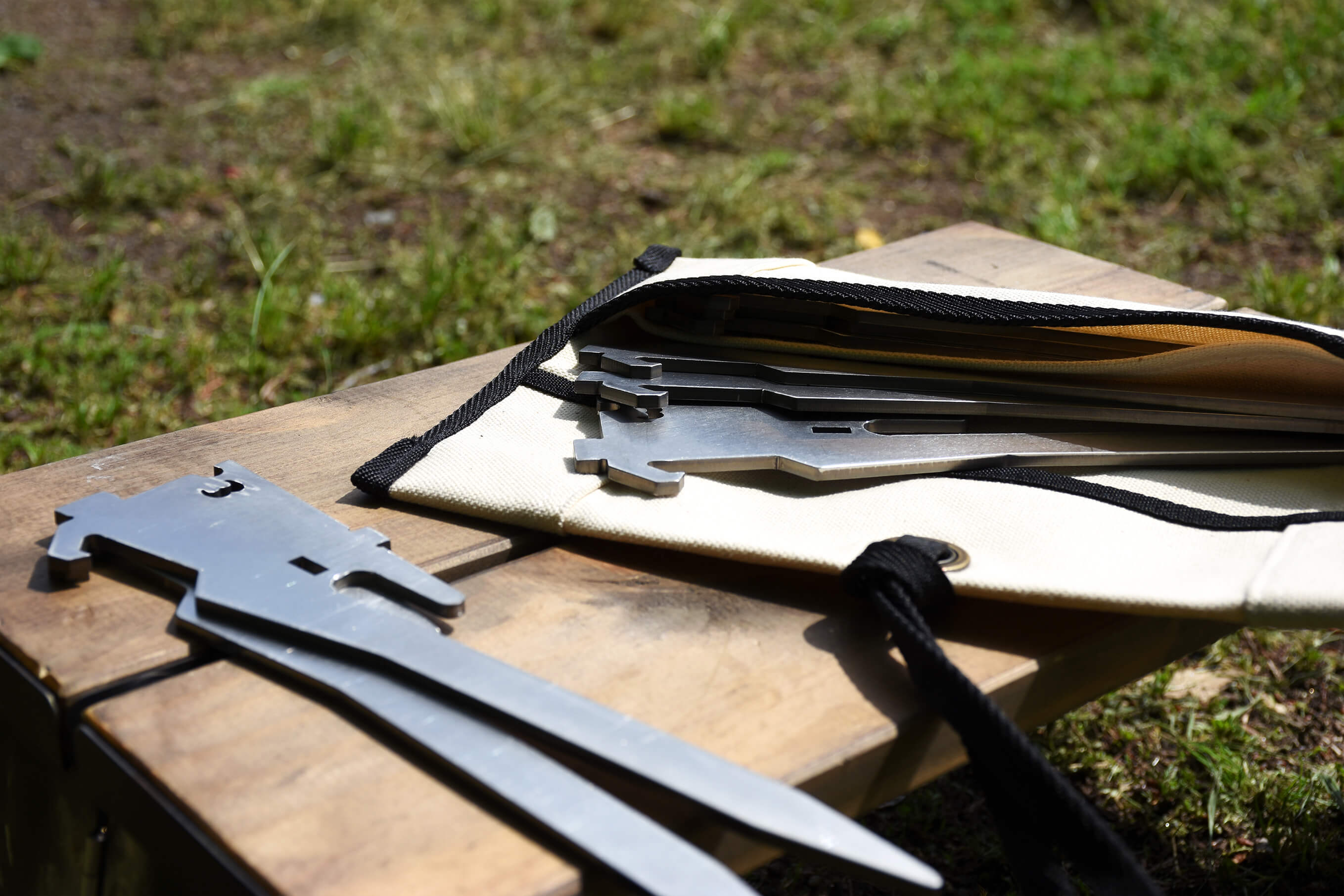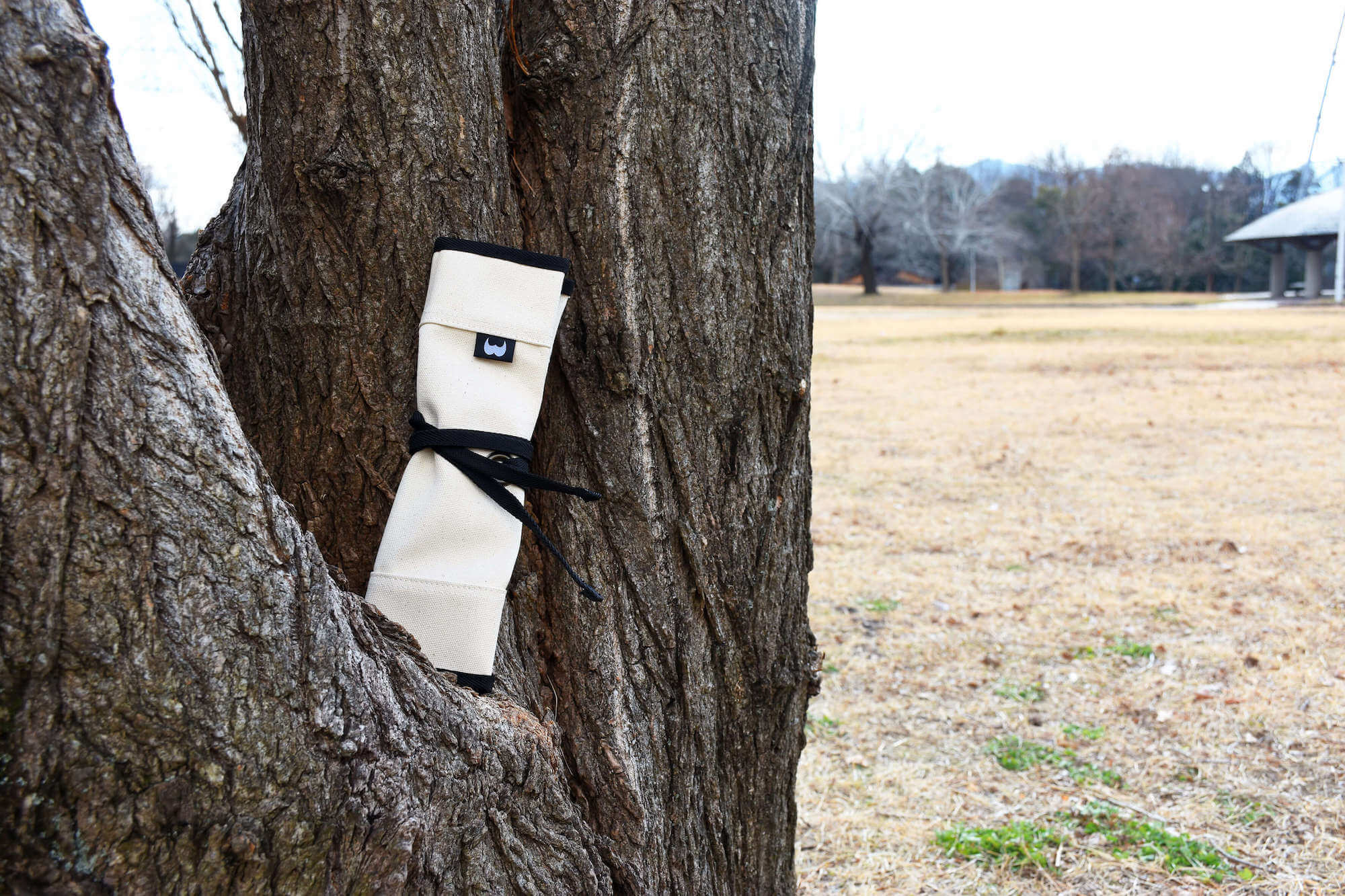 紐でくるくるっと包めば、まるでペンケースのような形でペグを持ち歩くことができます。Hammer pegに関わらず他のペグや、細長い小物などをまとめるのもおすすめです。