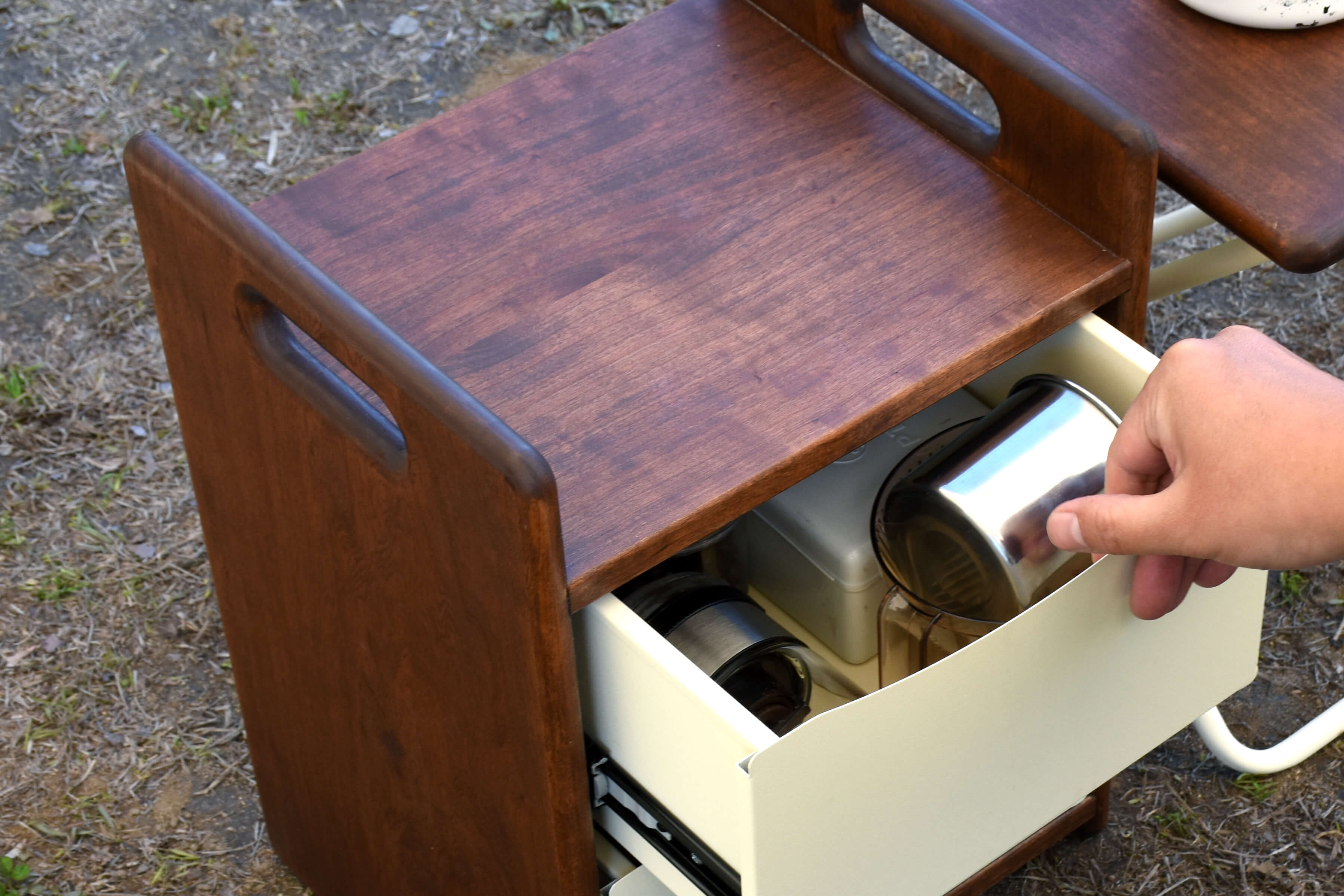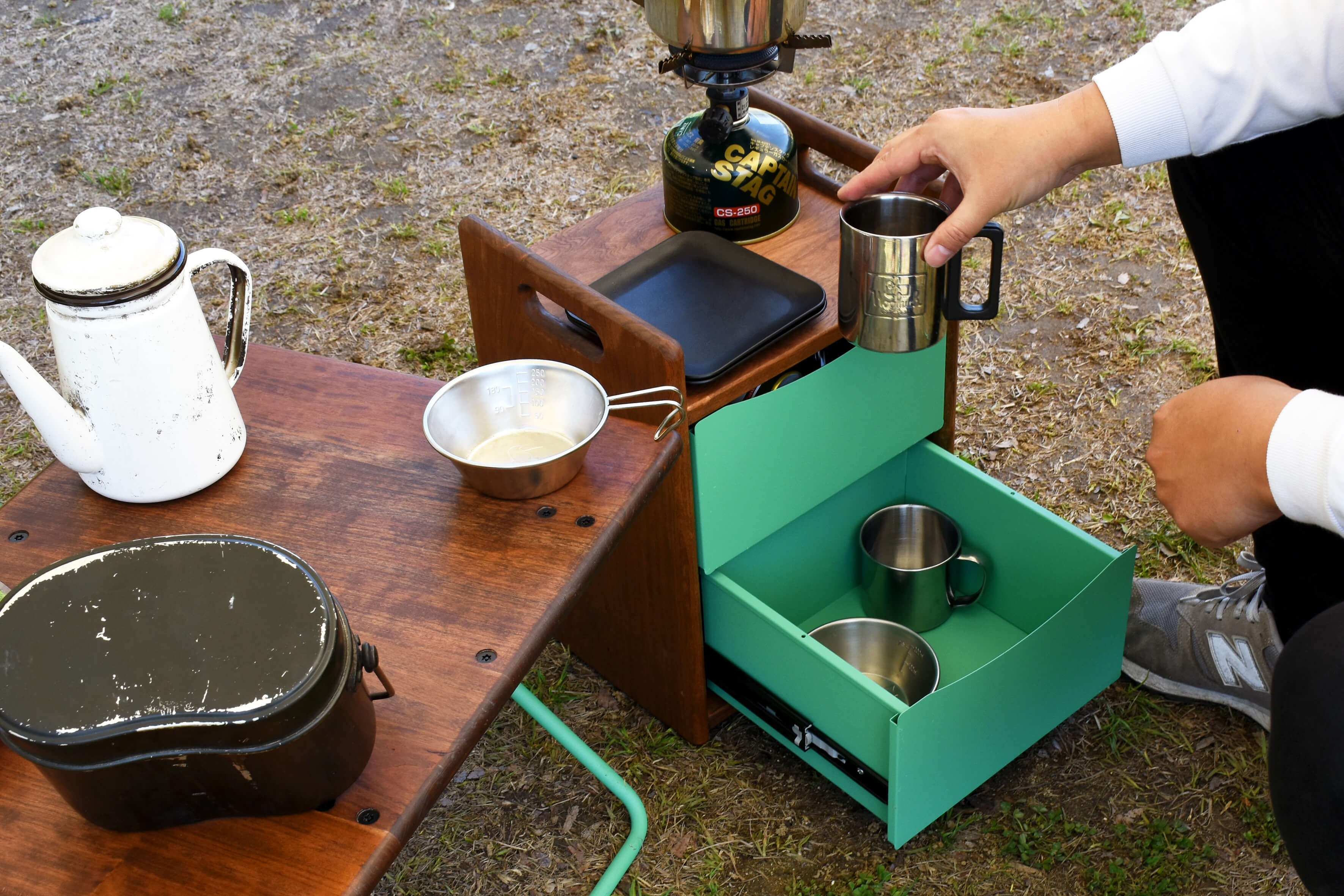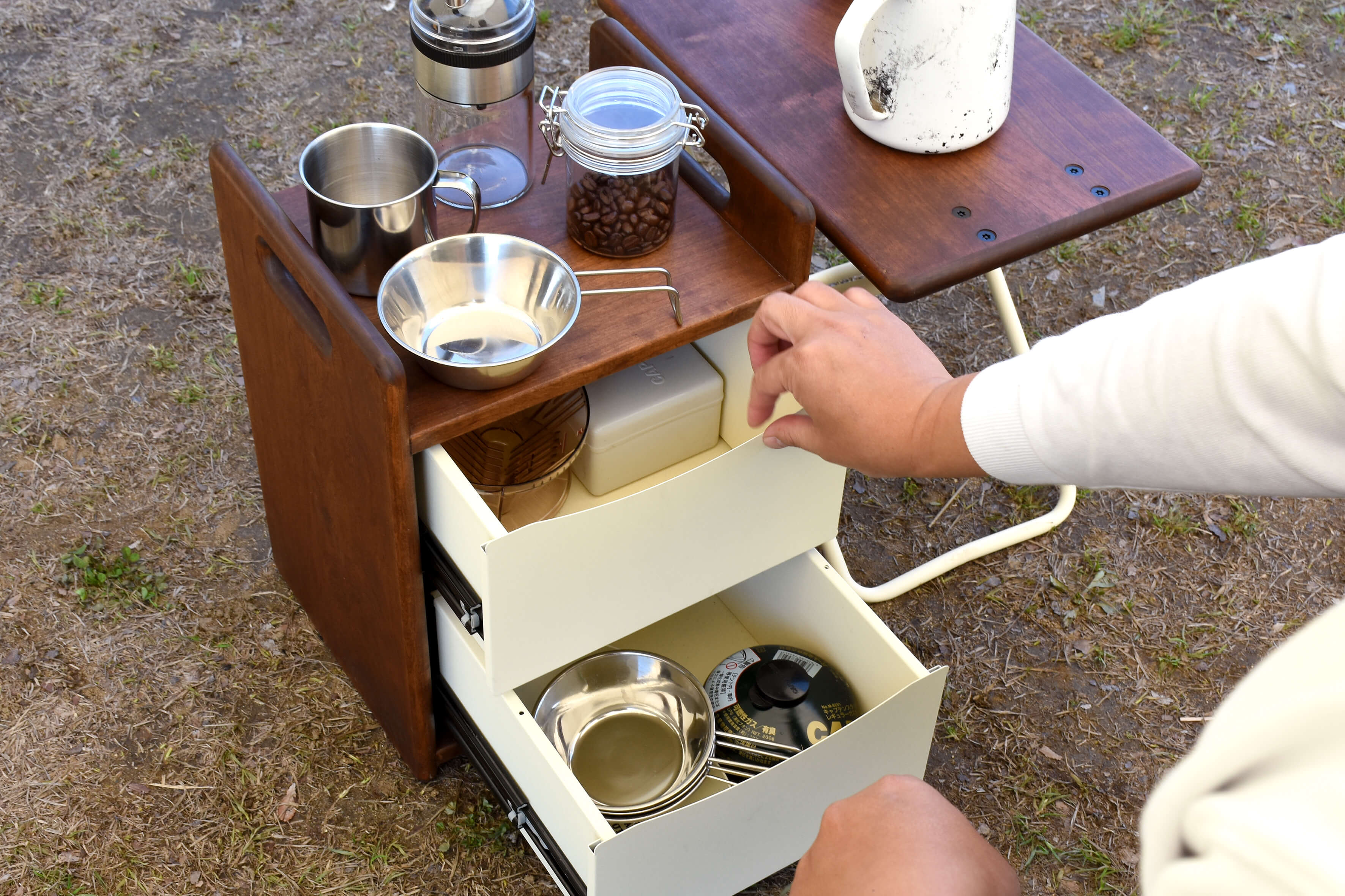 収納したクッカーやギアを、取り出してすぐテーブルとしても使用できます。