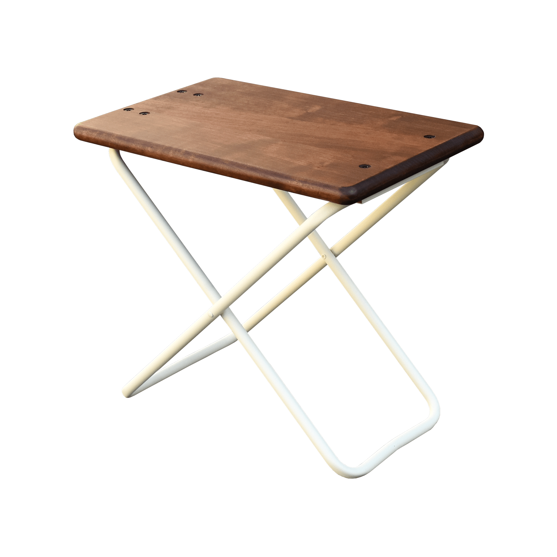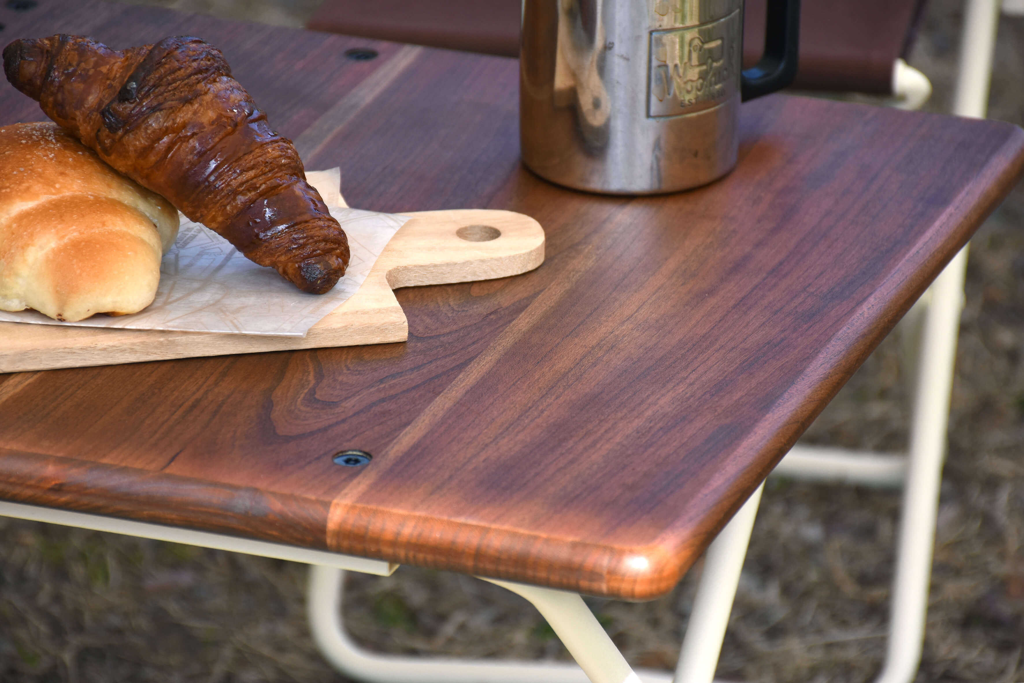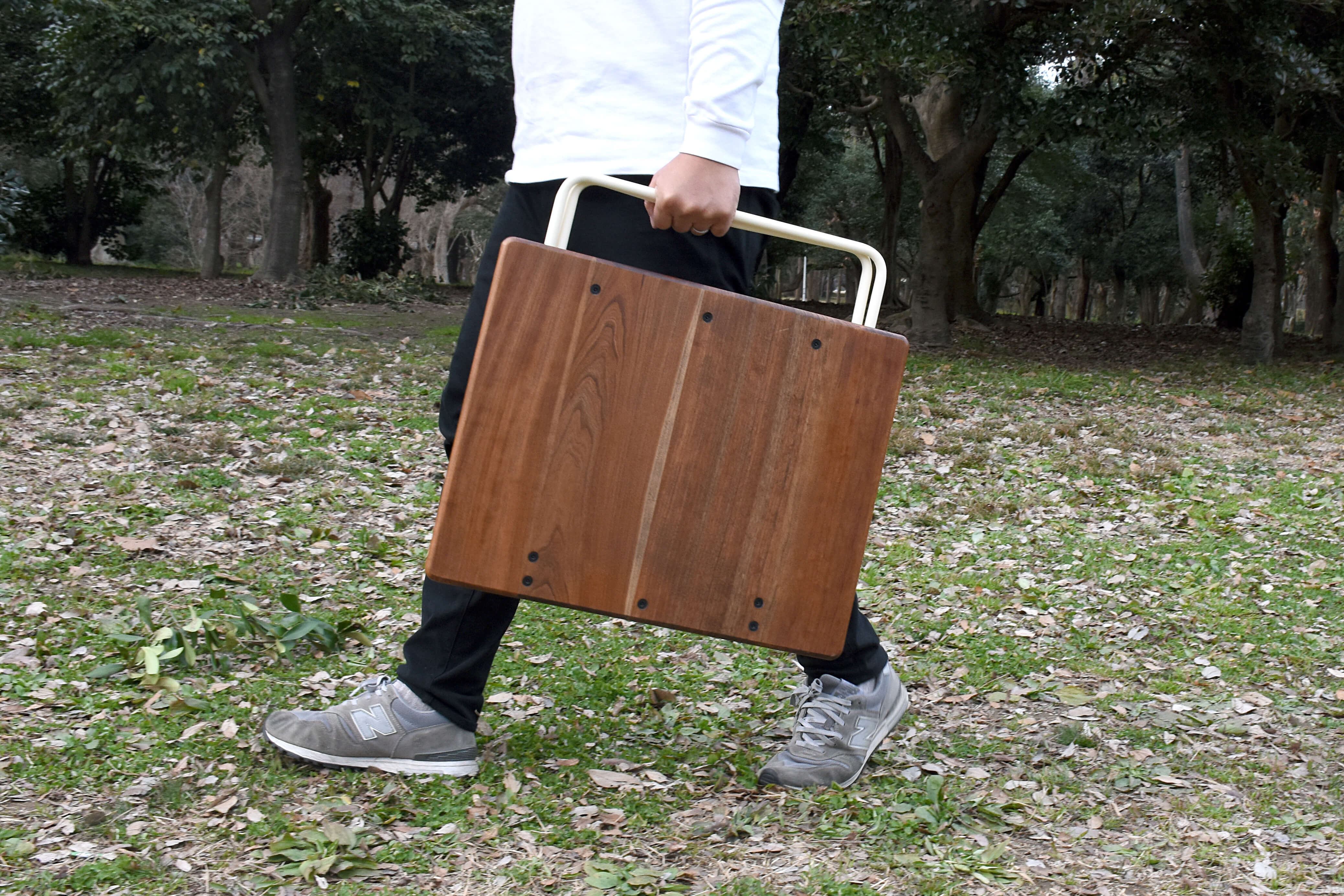 脚は折り畳めるので薄くなり、重ねたり隙間の収納スペースに収まります。天板はアメリカンチェリーを使用しており、丈夫で軽いのが特徴です。