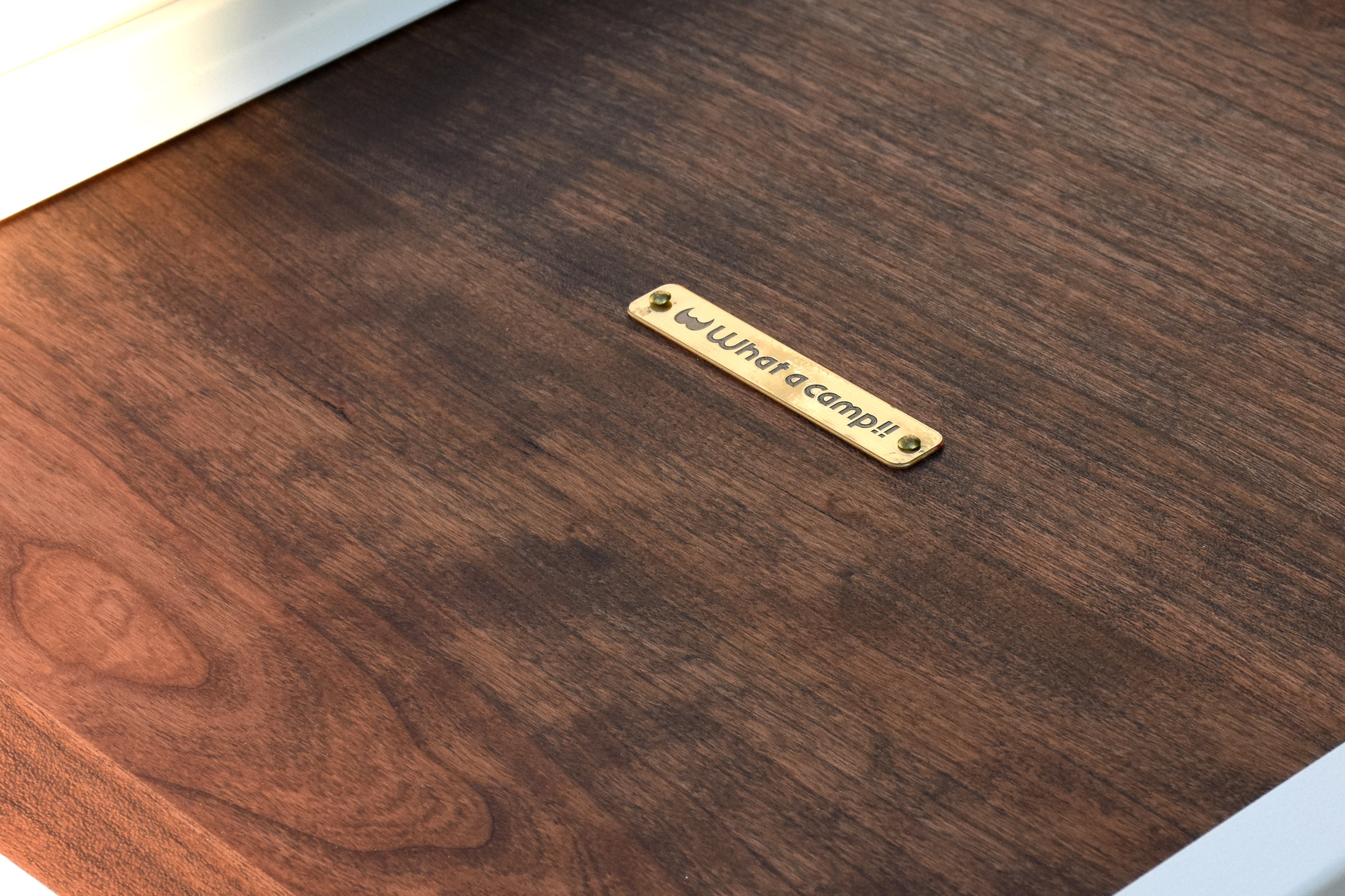 天板の裏側には真鍮のロゴプレートを取り付けました。